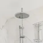 ويشتمل الحمام أيضًا على مجفف الشعر وملاءات الحمام والمناشف.